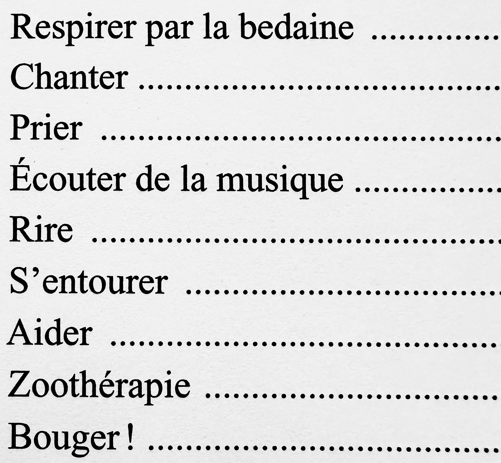 Trucs pour arrêter notre corps de produire des hormones de stress momentanément. J’en ai testés. Ça marche ! Évidemment, l’autrice les explique en détails. En voici: