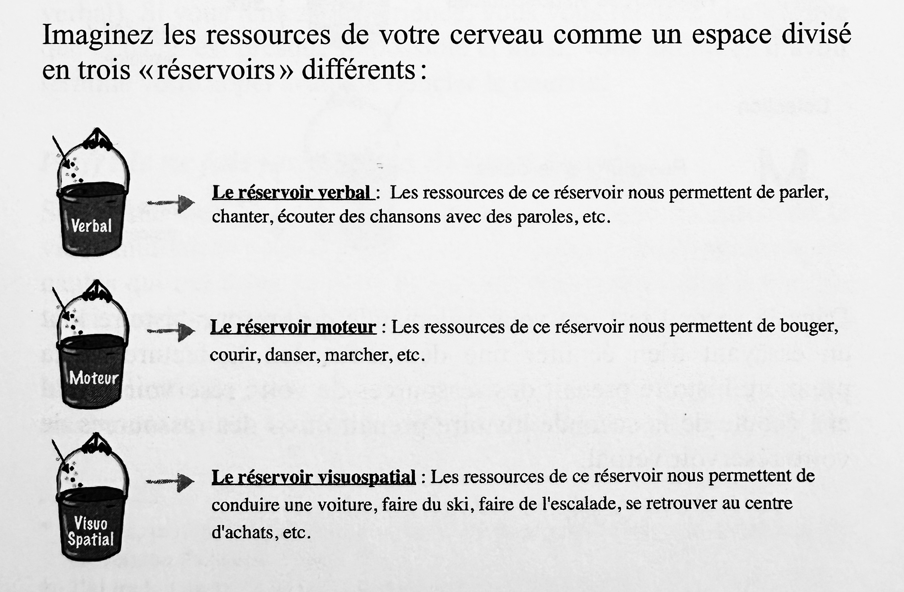 3 - J’ai appris qu’il était possible de faire du multitâche mais ces tâches doivent interpeller des régions différentes du cerveau, elle les appelle les “réservoirs”. Il y en a 3: le verbal, le moteur et le visuospatial. J’ai compris pourquoi il m’était quasi impossible de composer un texte, ou même des fois, de me concentrer à l’écriture d’un simple courriel, alors que de la musique avec des paroles passe en fond. Voilà le passage du livre qui explique de façon concise les 3 réservoirs: